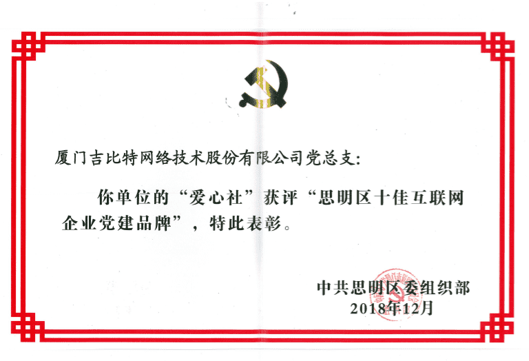 经初审评选、、、网络评选和专家评审等环节,,,,"厦门J9.COM网络技术股份有限公司党总支-爱心社" 从全区28个参评党建品牌中脱颖而出,,,,获评"思明区十佳互联网企业党建品牌"。。。